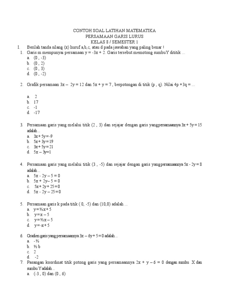 Pada bagian ini akan dibahas garis lurus. CONTOH SOAL LATIHAN MATEMATIKA PERSAMAAN GARIS LURUS KELAS 8 SMP Paijo Jowo Download PDF Download Full PDF Package This paper A short summary of this paper 27 Full PDFs related to this paper.